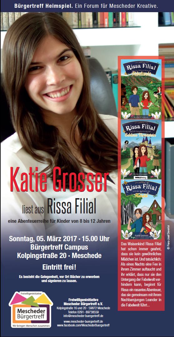 Am kommenden Sonntag, 05. März 2017, kommt Katie Grosser zurück nach Meschede. Ab 15:00 Uhr können im Bürgertreff Campus Kinder von 8-12 Jahren mit ihr und ihrer Romanheldin Rissa Filial in die Fabelwelt eintauchen. Auch „Große“ mit Lust auf einen fantastischen Nachmittag und Begegnungen mit Kobolden, Feen und Trollen sind willkommen. Der Eintritt ist frei.